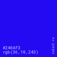 Цвет #240AF3 в цветовой модели RGB обозначается тремя октетами (36, 10, 243) в десятичном формате и #240AF3 в шестнадцатиричном (hex) формате, которые являются интенсивностью красного 36 (hex 24), интенсивность зелёного 10 (hex 0A) и интенсивность синего 243 (hex F3).