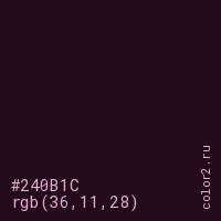 Цвет #240B1C в цветовой модели RGB обозначается тремя октетами (36, 11, 28) в десятичном формате и #240B1C в шестнадцатиричном (hex) формате, которые являются интенсивностью красного 36 (hex 24), интенсивность зелёного 11 (hex 0B) и интенсивность синего 28 (hex 1C).