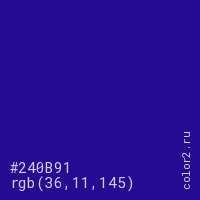 Цвет #240B91 в цветовой модели RGB обозначается тремя октетами (36, 11, 145) в десятичном формате и #240B91 в шестнадцатиричном (hex) формате, которые являются интенсивностью красного 36 (hex 24), интенсивность зелёного 11 (hex 0B) и интенсивность синего 145 (hex 91).