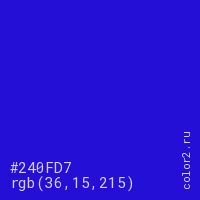 Цвет #240FD7 в цветовой модели RGB обозначается тремя октетами (36, 15, 215) в десятичном формате и #240FD7 в шестнадцатиричном (hex) формате, которые являются интенсивностью красного 36 (hex 24), интенсивность зелёного 15 (hex 0F) и интенсивность синего 215 (hex D7).