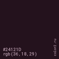 Цвет #24121D в цветовой модели RGB обозначается тремя октетами (36, 18, 29) в десятичном формате и #24121D в шестнадцатиричном (hex) формате, которые являются интенсивностью красного 36 (hex 24), интенсивность зелёного 18 (hex 12) и интенсивность синего 29 (hex 1D).
