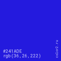 Цвет #241ADE в цветовой модели RGB обозначается тремя октетами (36, 26, 222) в десятичном формате и #241ADE в шестнадцатиричном (hex) формате, которые являются интенсивностью красного 36 (hex 24), интенсивность зелёного 26 (hex 1A) и интенсивность синего 222 (hex DE).