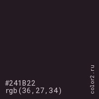 Цвет #241B22 в цветовой модели RGB обозначается тремя октетами (36, 27, 34) в десятичном формате и #241B22 в шестнадцатиричном (hex) формате, которые являются интенсивностью красного 36 (hex 24), интенсивность зелёного 27 (hex 1B) и интенсивность синего 34 (hex 22).