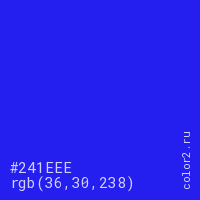 Цвет #241EEE в цветовой модели RGB обозначается тремя октетами (36, 30, 238) в десятичном формате и #241EEE в шестнадцатиричном (hex) формате, которые являются интенсивностью красного 36 (hex 24), интенсивность зелёного 30 (hex 1E) и интенсивность синего 238 (hex EE).