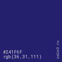 Цвет #241F6F в цветовой модели RGB обозначается тремя октетами (36, 31, 111) в десятичном формате и #241F6F в шестнадцатиричном (hex) формате, которые являются интенсивностью красного 36 (hex 24), интенсивность зелёного 31 (hex 1F) и интенсивность синего 111 (hex 6F).