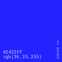 Цвет #2423FF в цветовой модели RGB обозначается тремя октетами (36, 35, 255) в десятичном формате и #2423FF в шестнадцатиричном (hex) формате, которые являются интенсивностью красного 36 (hex 24), интенсивность зелёного 35 (hex 23) и интенсивность синего 255 (hex FF).