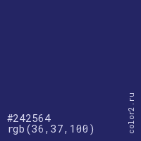 Цвет #242564 в цветовой модели RGB обозначается тремя октетами (36, 37, 100) в десятичном формате и #242564 в шестнадцатиричном (hex) формате, которые являются интенсивностью красного 36 (hex 24), интенсивность зелёного 37 (hex 25) и интенсивность синего 100 (hex 64).