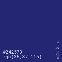 Цвет #242573 в цветовой модели RGB обозначается тремя октетами (36, 37, 115) в десятичном формате и #242573 в шестнадцатиричном (hex) формате, которые являются интенсивностью красного 36 (hex 24), интенсивность зелёного 37 (hex 25) и интенсивность синего 115 (hex 73).