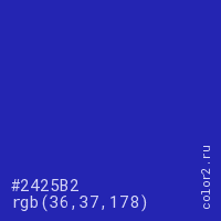 Цвет #2425B2 в цветовой модели RGB обозначается тремя октетами (36, 37, 178) в десятичном формате и #2425B2 в шестнадцатиричном (hex) формате, которые являются интенсивностью красного 36 (hex 24), интенсивность зелёного 37 (hex 25) и интенсивность синего 178 (hex B2).