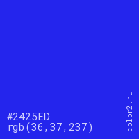 Цвет #2425ED в цветовой модели RGB обозначается тремя октетами (36, 37, 237) в десятичном формате и #2425ED в шестнадцатиричном (hex) формате, которые являются интенсивностью красного 36 (hex 24), интенсивность зелёного 37 (hex 25) и интенсивность синего 237 (hex ED).
