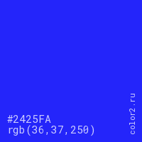 Цвет #2425FA в цветовой модели RGB обозначается тремя октетами (36, 37, 250) в десятичном формате и #2425FA в шестнадцатиричном (hex) формате, которые являются интенсивностью красного 36 (hex 24), интенсивность зелёного 37 (hex 25) и интенсивность синего 250 (hex FA).
