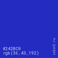 Цвет #242BC0 в цветовой модели RGB обозначается тремя октетами (36, 43, 192) в десятичном формате и #242BC0 в шестнадцатиричном (hex) формате, которые являются интенсивностью красного 36 (hex 24), интенсивность зелёного 43 (hex 2B) и интенсивность синего 192 (hex C0).