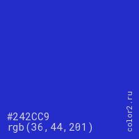 Цвет #242CC9 в цветовой модели RGB обозначается тремя октетами (36, 44, 201) в десятичном формате и #242CC9 в шестнадцатиричном (hex) формате, которые являются интенсивностью красного 36 (hex 24), интенсивность зелёного 44 (hex 2C) и интенсивность синего 201 (hex C9).
