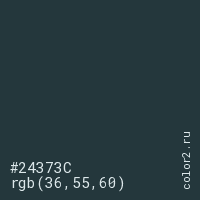 Цвет #24373C в цветовой модели RGB обозначается тремя октетами (36, 55, 60) в десятичном формате и #24373C в шестнадцатиричном (hex) формате, которые являются интенсивностью красного 36 (hex 24), интенсивность зелёного 55 (hex 37) и интенсивность синего 60 (hex 3C).