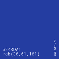 Цвет #243DA1 в цветовой модели RGB обозначается тремя октетами (36, 61, 161) в десятичном формате и #243DA1 в шестнадцатиричном (hex) формате, которые являются интенсивностью красного 36 (hex 24), интенсивность зелёного 61 (hex 3D) и интенсивность синего 161 (hex A1).