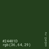Цвет #24401D в цветовой модели RGB обозначается тремя октетами (36, 64, 29) в десятичном формате и #24401D в шестнадцатиричном (hex) формате, которые являются интенсивностью красного 36 (hex 24), интенсивность зелёного 64 (hex 40) и интенсивность синего 29 (hex 1D).