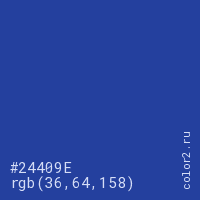 Цвет #24409E в цветовой модели RGB обозначается тремя октетами (36, 64, 158) в десятичном формате и #24409E в шестнадцатиричном (hex) формате, которые являются интенсивностью красного 36 (hex 24), интенсивность зелёного 64 (hex 40) и интенсивность синего 158 (hex 9E).