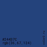 Цвет #24437C в цветовой модели RGB обозначается тремя октетами (36, 67, 124) в десятичном формате и #24437C в шестнадцатиричном (hex) формате, которые являются интенсивностью красного 36 (hex 24), интенсивность зелёного 67 (hex 43) и интенсивность синего 124 (hex 7C).