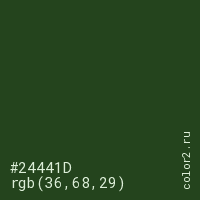 Цвет #24441D в цветовой модели RGB обозначается тремя октетами (36, 68, 29) в десятичном формате и #24441D в шестнадцатиричном (hex) формате, которые являются интенсивностью красного 36 (hex 24), интенсивность зелёного 68 (hex 44) и интенсивность синего 29 (hex 1D).