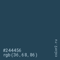 Цвет #244456 в цветовой модели RGB обозначается тремя октетами (36, 68, 86) в десятичном формате и #244456 в шестнадцатиричном (hex) формате, которые являются интенсивностью красного 36 (hex 24), интенсивность зелёного 68 (hex 44) и интенсивность синего 86 (hex 56).