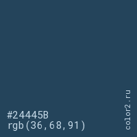 Цвет #24445B в цветовой модели RGB обозначается тремя октетами (36, 68, 91) в десятичном формате и #24445B в шестнадцатиричном (hex) формате, которые являются интенсивностью красного 36 (hex 24), интенсивность зелёного 68 (hex 44) и интенсивность синего 91 (hex 5B).