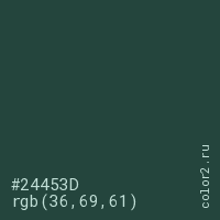 Цвет #24453D в цветовой модели RGB обозначается тремя октетами (36, 69, 61) в десятичном формате и #24453D в шестнадцатиричном (hex) формате, которые являются интенсивностью красного 36 (hex 24), интенсивность зелёного 69 (hex 45) и интенсивность синего 61 (hex 3D).