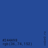 Цвет #244A98 в цветовой модели RGB обозначается тремя октетами (36, 74, 152) в десятичном формате и #244A98 в шестнадцатиричном (hex) формате, которые являются интенсивностью красного 36 (hex 24), интенсивность зелёного 74 (hex 4A) и интенсивность синего 152 (hex 98).