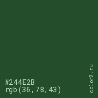 Цвет #244E2B в цветовой модели RGB обозначается тремя октетами (36, 78, 43) в десятичном формате и #244E2B в шестнадцатиричном (hex) формате, которые являются интенсивностью красного 36 (hex 24), интенсивность зелёного 78 (hex 4E) и интенсивность синего 43 (hex 2B).
