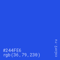Цвет #244FE6 в цветовой модели RGB обозначается тремя октетами (36, 79, 230) в десятичном формате и #244FE6 в шестнадцатиричном (hex) формате, которые являются интенсивностью красного 36 (hex 24), интенсивность зелёного 79 (hex 4F) и интенсивность синего 230 (hex E6).