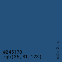 Цвет #24517B в цветовой модели RGB обозначается тремя октетами (36, 81, 123) в десятичном формате и #24517B в шестнадцатиричном (hex) формате, которые являются интенсивностью красного 36 (hex 24), интенсивность зелёного 81 (hex 51) и интенсивность синего 123 (hex 7B).
