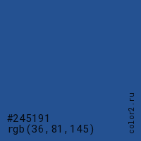 Цвет #245191 в цветовой модели RGB обозначается тремя октетами (36, 81, 145) в десятичном формате и #245191 в шестнадцатиричном (hex) формате, которые являются интенсивностью красного 36 (hex 24), интенсивность зелёного 81 (hex 51) и интенсивность синего 145 (hex 91).