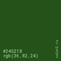 Цвет #245218 в цветовой модели RGB обозначается тремя октетами (36, 82, 24) в десятичном формате и #245218 в шестнадцатиричном (hex) формате, которые являются интенсивностью красного 36 (hex 24), интенсивность зелёного 82 (hex 52) и интенсивность синего 24 (hex 18).