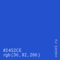 Цвет #2452CE в цветовой модели RGB обозначается тремя октетами (36, 82, 206) в десятичном формате и #2452CE в шестнадцатиричном (hex) формате, которые являются интенсивностью красного 36 (hex 24), интенсивность зелёного 82 (hex 52) и интенсивность синего 206 (hex CE).
