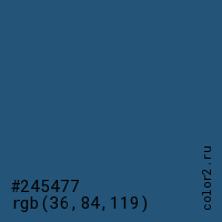 Цвет #245477 в цветовой модели RGB обозначается тремя октетами (36, 84, 119) в десятичном формате и #245477 в шестнадцатиричном (hex) формате, которые являются интенсивностью красного 36 (hex 24), интенсивность зелёного 84 (hex 54) и интенсивность синего 119 (hex 77).