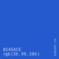 Цвет #245ACE в цветовой модели RGB обозначается тремя октетами (36, 90, 206) в десятичном формате и #245ACE в шестнадцатиричном (hex) формате, которые являются интенсивностью красного 36 (hex 24), интенсивность зелёного 90 (hex 5A) и интенсивность синего 206 (hex CE).