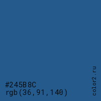 Цвет #245B8C в цветовой модели RGB обозначается тремя октетами (36, 91, 140) в десятичном формате и #245B8C в шестнадцатиричном (hex) формате, которые являются интенсивностью красного 36 (hex 24), интенсивность зелёного 91 (hex 5B) и интенсивность синего 140 (hex 8C).
