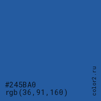 Цвет #245BA0 в цветовой модели RGB обозначается тремя октетами (36, 91, 160) в десятичном формате и #245BA0 в шестнадцатиричном (hex) формате, которые являются интенсивностью красного 36 (hex 24), интенсивность зелёного 91 (hex 5B) и интенсивность синего 160 (hex A0).