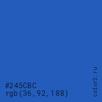 Цвет #245CBC в цветовой модели RGB обозначается тремя октетами (36, 92, 188) в десятичном формате и #245CBC в шестнадцатиричном (hex) формате, которые являются интенсивностью красного 36 (hex 24), интенсивность зелёного 92 (hex 5C) и интенсивность синего 188 (hex BC).