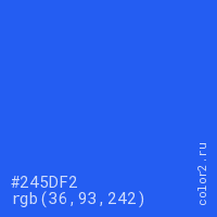 Цвет #245DF2 в цветовой модели RGB обозначается тремя октетами (36, 93, 242) в десятичном формате и #245DF2 в шестнадцатиричном (hex) формате, которые являются интенсивностью красного 36 (hex 24), интенсивность зелёного 93 (hex 5D) и интенсивность синего 242 (hex F2).