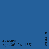Цвет #24609B в цветовой модели RGB обозначается тремя октетами (36, 96, 155) в десятичном формате и #24609B в шестнадцатиричном (hex) формате, которые являются интенсивностью красного 36 (hex 24), интенсивность зелёного 96 (hex 60) и интенсивность синего 155 (hex 9B).