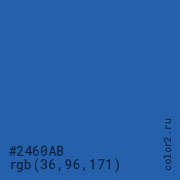 Цвет #2460AB в цветовой модели RGB обозначается тремя октетами (36, 96, 171) в десятичном формате и #2460AB в шестнадцатиричном (hex) формате, которые являются интенсивностью красного 36 (hex 24), интенсивность зелёного 96 (hex 60) и интенсивность синего 171 (hex AB).