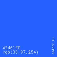 Цвет #2461FE в цветовой модели RGB обозначается тремя октетами (36, 97, 254) в десятичном формате и #2461FE в шестнадцатиричном (hex) формате, которые являются интенсивностью красного 36 (hex 24), интенсивность зелёного 97 (hex 61) и интенсивность синего 254 (hex FE).