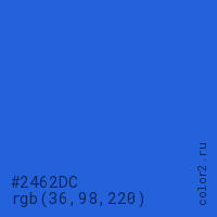 Цвет #2462DC в цветовой модели RGB обозначается тремя октетами (36, 98, 220) в десятичном формате и #2462DC в шестнадцатиричном (hex) формате, которые являются интенсивностью красного 36 (hex 24), интенсивность зелёного 98 (hex 62) и интенсивность синего 220 (hex DC).