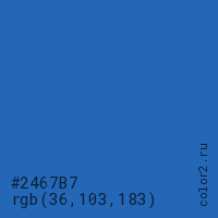 Цвет #2467B7 в цветовой модели RGB обозначается тремя октетами (36, 103, 183) в десятичном формате и #2467B7 в шестнадцатиричном (hex) формате, которые являются интенсивностью красного 36 (hex 24), интенсивность зелёного 103 (hex 67) и интенсивность синего 183 (hex B7).