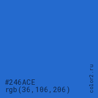 Цвет #246ACE в цветовой модели RGB обозначается тремя октетами (36, 106, 206) в десятичном формате и #246ACE в шестнадцатиричном (hex) формате, которые являются интенсивностью красного 36 (hex 24), интенсивность зелёного 106 (hex 6A) и интенсивность синего 206 (hex CE).