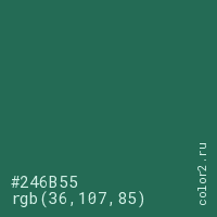 Цвет #246B55 в цветовой модели RGB обозначается тремя октетами (36, 107, 85) в десятичном формате и #246B55 в шестнадцатиричном (hex) формате, которые являются интенсивностью красного 36 (hex 24), интенсивность зелёного 107 (hex 6B) и интенсивность синего 85 (hex 55).
