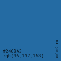 Цвет #246BA3 в цветовой модели RGB обозначается тремя октетами (36, 107, 163) в десятичном формате и #246BA3 в шестнадцатиричном (hex) формате, которые являются интенсивностью красного 36 (hex 24), интенсивность зелёного 107 (hex 6B) и интенсивность синего 163 (hex A3).