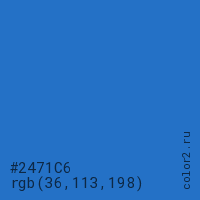 Цвет #2471C6 в цветовой модели RGB обозначается тремя октетами (36, 113, 198) в десятичном формате и #2471C6 в шестнадцатиричном (hex) формате, которые являются интенсивностью красного 36 (hex 24), интенсивность зелёного 113 (hex 71) и интенсивность синего 198 (hex C6).