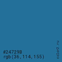 Цвет #24729B в цветовой модели RGB обозначается тремя октетами (36, 114, 155) в десятичном формате и #24729B в шестнадцатиричном (hex) формате, которые являются интенсивностью красного 36 (hex 24), интенсивность зелёного 114 (hex 72) и интенсивность синего 155 (hex 9B).