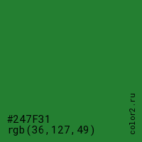 Цвет #247F31 в цветовой модели RGB обозначается тремя октетами (36, 127, 49) в десятичном формате и #247F31 в шестнадцатиричном (hex) формате, которые являются интенсивностью красного 36 (hex 24), интенсивность зелёного 127 (hex 7F) и интенсивность синего 49 (hex 31).